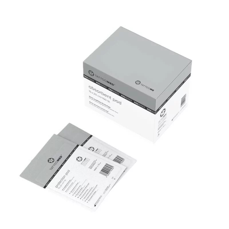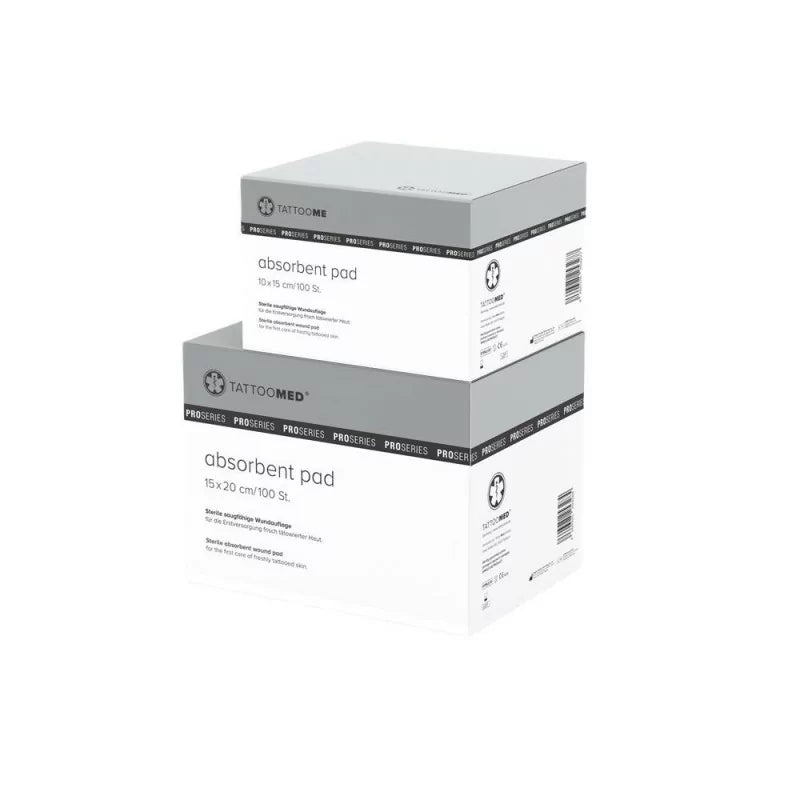 TattooMed Absorbent Pad is a professional, sterile wound dressing designed for the crucial initial care of freshly tattooed skin. Available in sizes 10x15cm or 15x20cm, each package contains 100 highly absorbent pads, making it ideal for studios and aftercare routines.