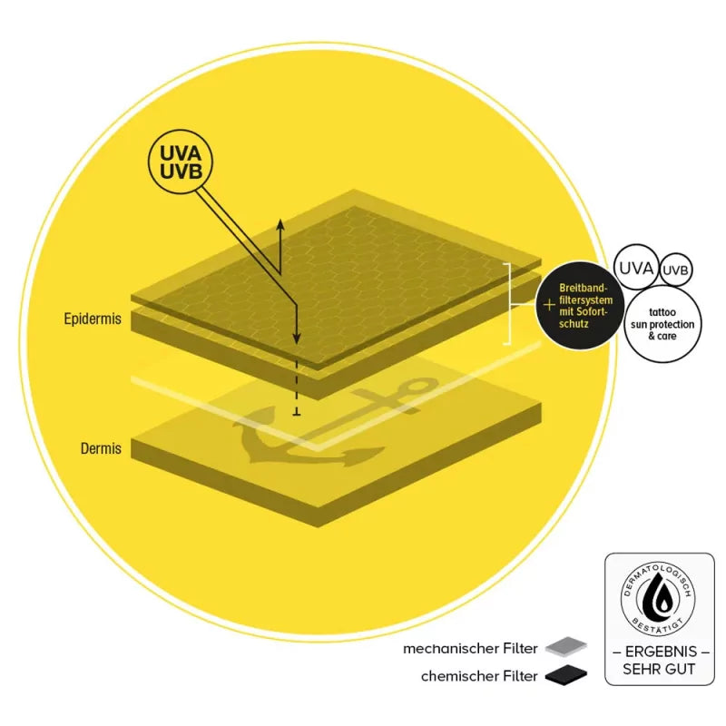 Apply generously to tattooed skin before sun exposure. Reapply regularly, especially after swimming or sweating, to maintain optimal protection.