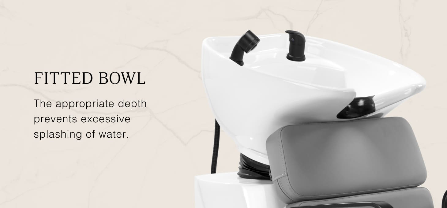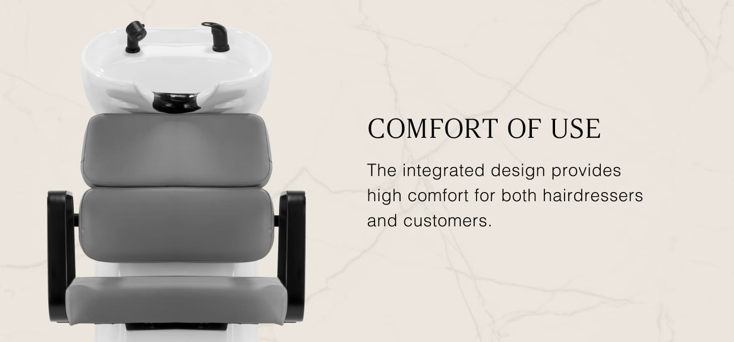 The appropriate depth of the white ceramic washbasin bowl prevents excessive splashing of water or products used during treatments. This allows for comfortable and effective performance of a wide range of services. The angle of the bowl can be adjusted, making it easy to adapt to individual needs. The high quality of the materials used makes the washbasin durable, resistant to discoloration and scratches, and very easy to clean. A properly profiled collar and inclined backrest provide support and comfort when washing the hair, and thanks to the comfortable black plastic overlay, the customer will not feel the unpleasantness of the cold ceramic surface.