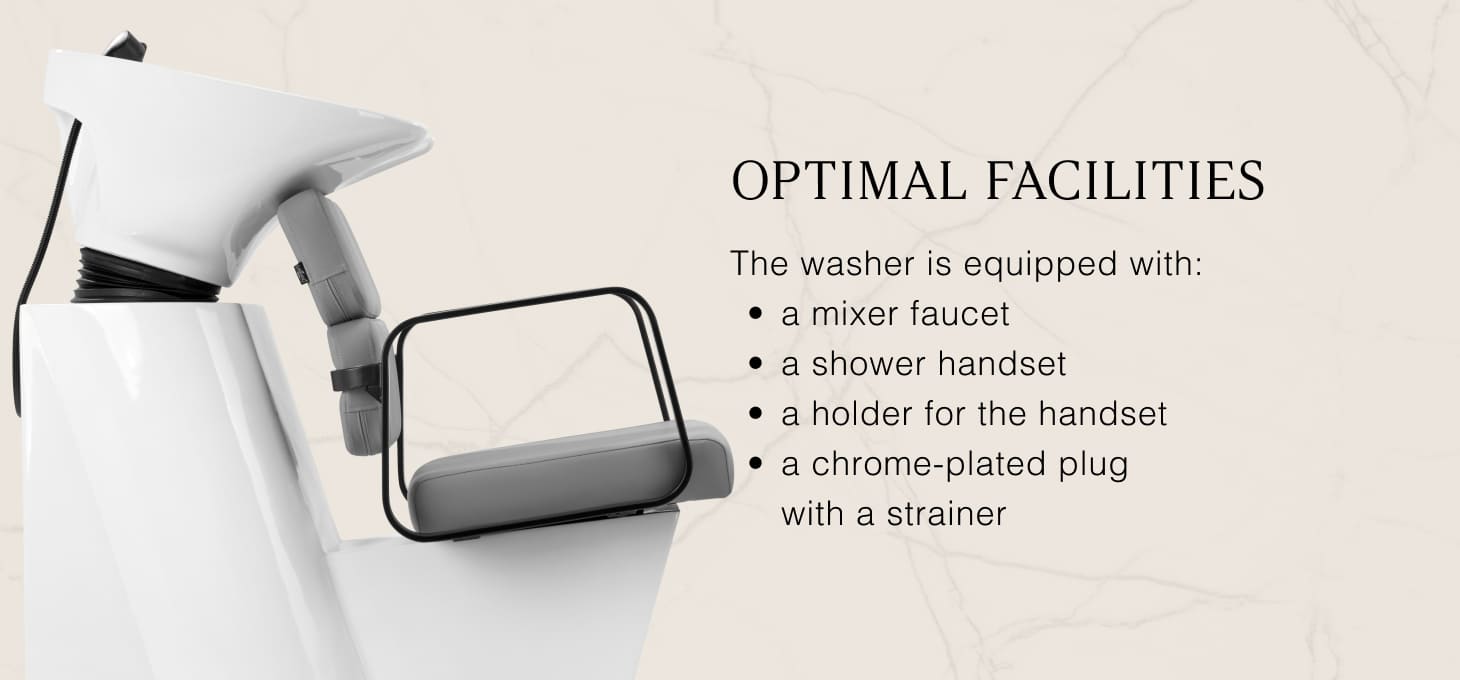 The practical hair wash unit is equipped with a mixer faucet, which provides easy access to hot and cold water. This makes it easier to adjust the temperature to the customer's individual preferences. A dedicated place to hang up the handset makes work easier, and the chrome-plated plug with a special strainer allows you to control the water flow and maintain high hygiene standards in the salon. The water connection has been placed inside the base, allowing the pipes to be easily hidden. A significant advantage of this model is the opening left between the backrest and the seat, which makes it easier to keep the living room clean by allowing you to easily sweep dirt from every nook and cranny of the chair. The hair wash unit has been designed in such a way as to ensure comfort during various treatments, ensuring proper back support. The combination of functionality and amenities makes working in a hairdressing salon even more comfortable.