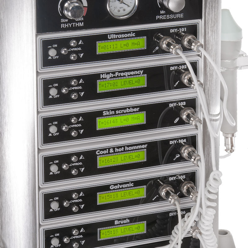 6. D'arsonval / High-Frequency / electrotherapy - enables electrotherapy using the so-called D'Arsonval currents. When the glass electrode touches the skin, the spark has a stimulating effect on the skin and underlying tissues, mainly and indirectly on the internal organs. Oxygen produced during the procedure has a antibacterial effect. Electrical charges cause dilation of blood vessels, accelerate metabolism, increase absorption of nutrients and medicinal substances contained in cosmetic preparations.