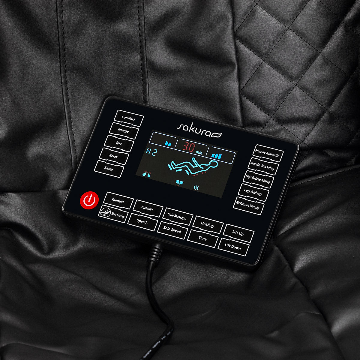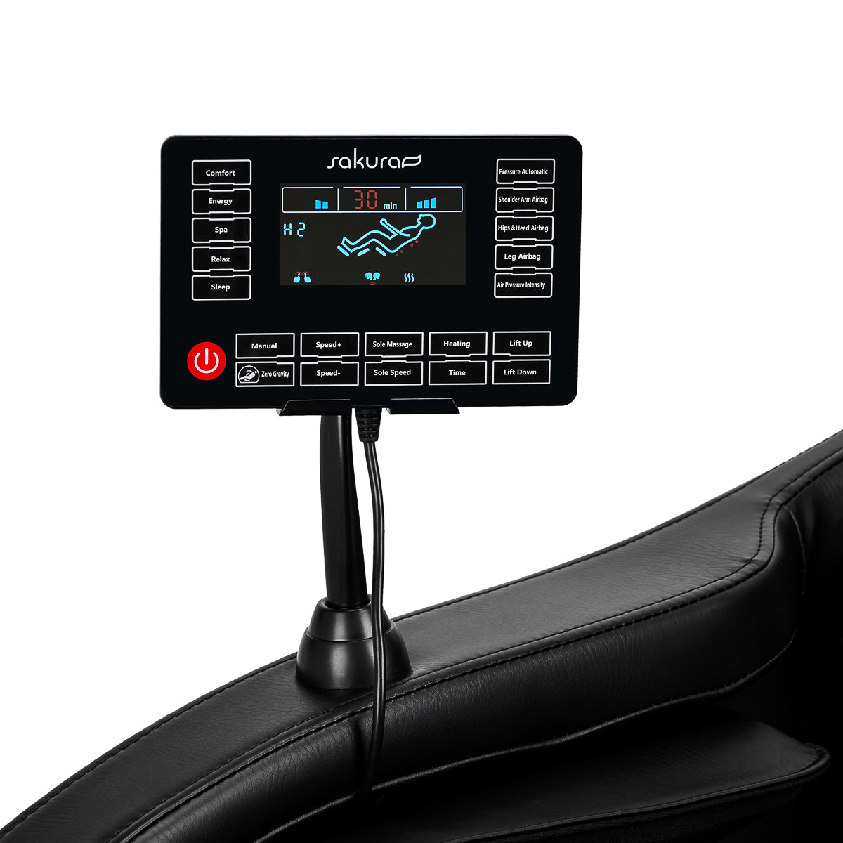 With the transparent control panel – which can be placed on the handle mounted on the right armrest or held in the hands – using the chair is simple and pleasant. You can follow the operation of the device on the clear LCD screen. The areas of the body currently being massaged, intensity of the treatment, service time and the selected program are clearly displayed. The panel allows you to freely adjust the settings of the chair and massage functions, as well as set the duration of the treatment, which can last 5, 10, 15, 20, 25 or 30 minutes.