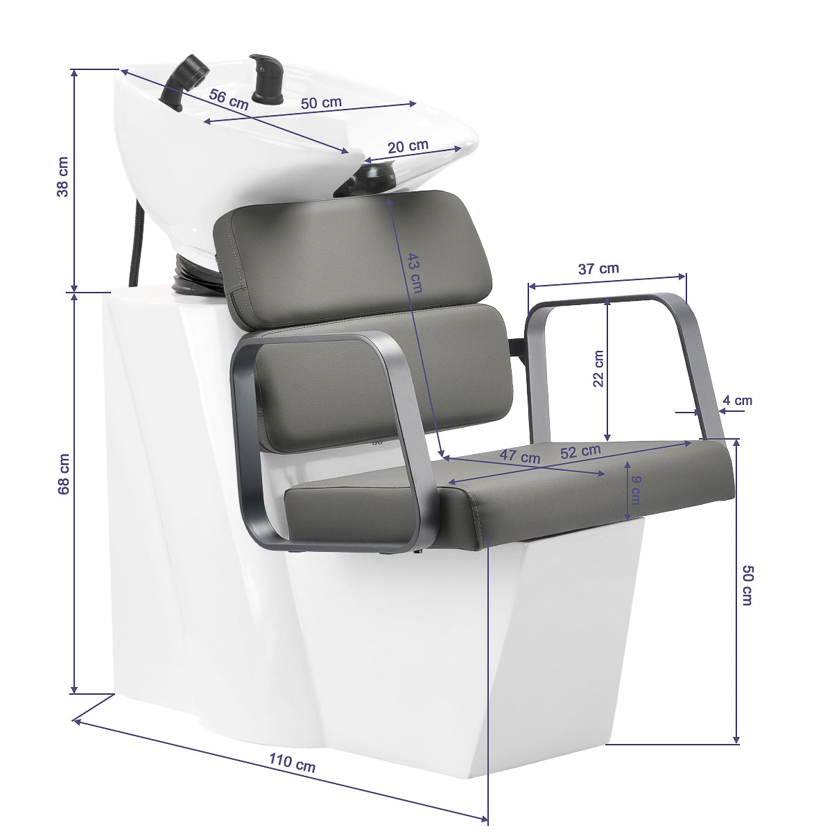 The profiled chair provides adequate lumbar support and, therefore, high comfort of use. Metal armrests in shades of gry with a geometric shape allow for the correct positioning of the customer's shoulders. Filling with durable, deformation-resistant foam and upholstery made of pleasant-to-touch synthetic leather in shades of gray ensure the durability of the furniture, ease of cleaning and comfortable use for a long time. The original, elegant appearance of the hair wash unit gives the interior a unique expression. The set includes complete fittings in shades of black, including a faucet, a shower head and dedicated hoses to provide a complete set of tools for work.
