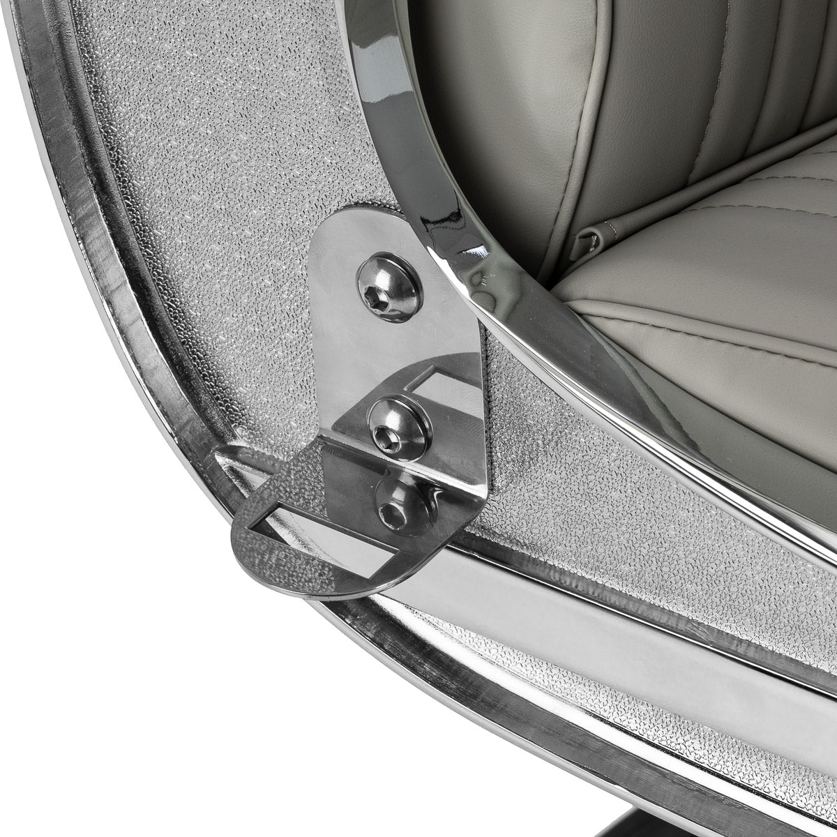 Sturdy base construction ensures stability and high comfort. The seat is filled with deformation-resistant foam and upholstered with soft, matt synthetic leather, combining durability with comfort. The materials used for the finish are moisture-resistant, durable and easy to clean, making the chair perfect for everyday use. Stylish stitching and upholstery in shades of grey give it a unique character, blending perfectly with the décor of modern barbershops.