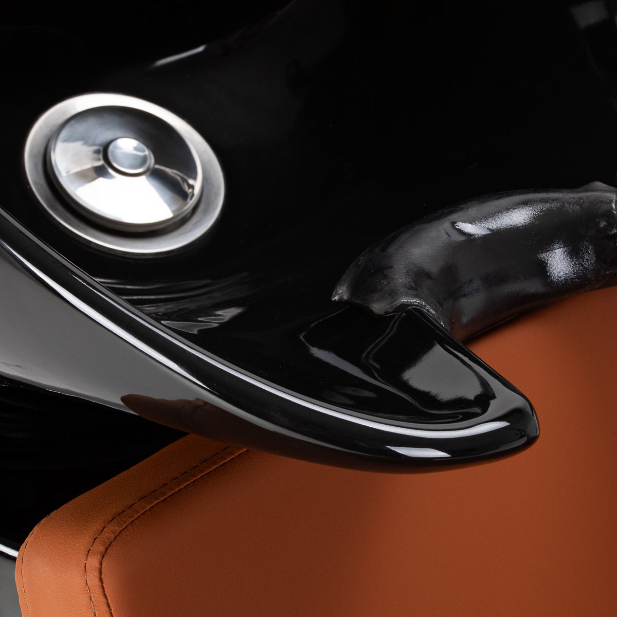 The deep ceramic bowl in shades of black minimises splashing of water and cosmetics during treatments. The adjustable angle of the bowl allows for precise adjustment to the customer's needs. Made of durable material, it is resistant to discolouration, scratches and chemicals, and its smooth surface makes it easy to keep clean. The ergonomically contoured collar provides comfortable head support, and the black plastic cover eliminates the feeling of cold when in contact with the ceramic.