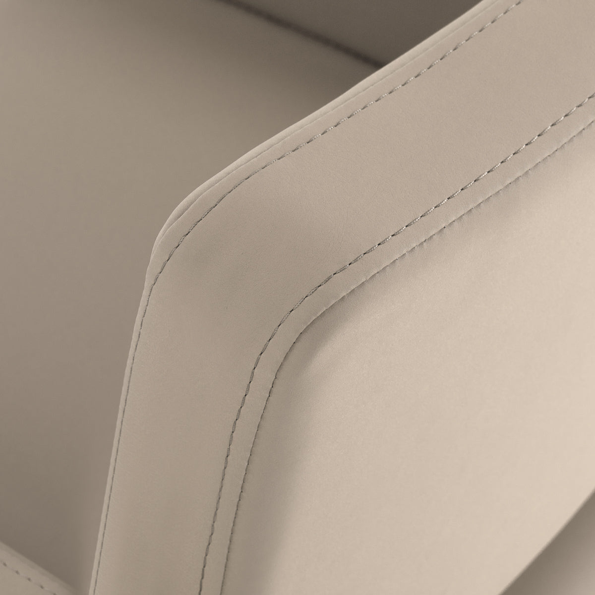 The rounded lines of the chair introduce lightness and modern aesthetics, while the stable, square base in matte black emphasises its stylish appearance. The pleasant-to-the-touch synthetic leather in shades of grey and beige ensures comfort even during long treatments, while also guaranteeing durability, moisture resistance and ease of cleaning. The chair fits both modern and classic interiors, emphasising the professional image of the salon.